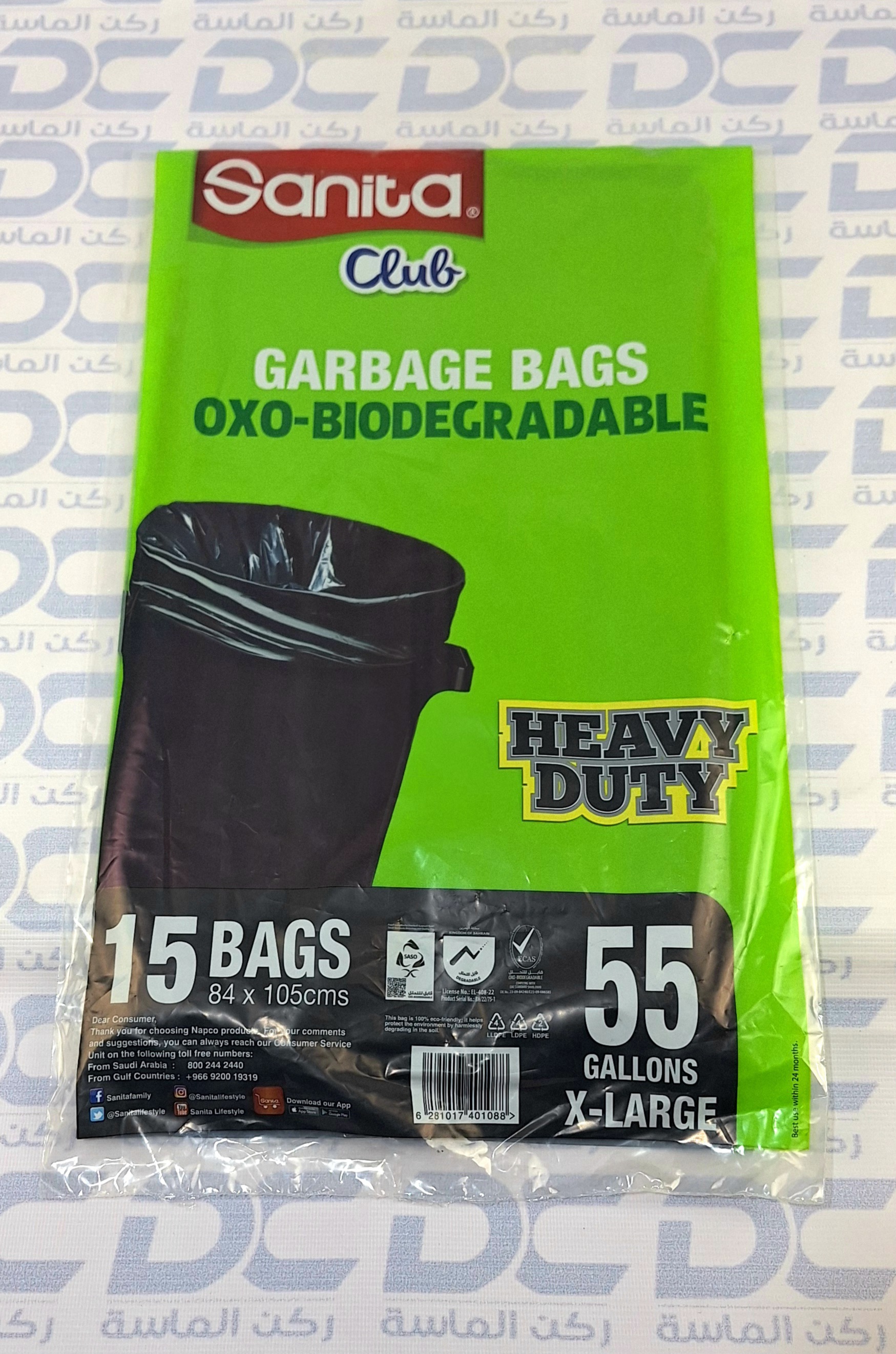 أكياس نفاية سانيتا كلوب 15 كيس 55 جالون كبير جدا قابلة للتحلل عالية المتانة